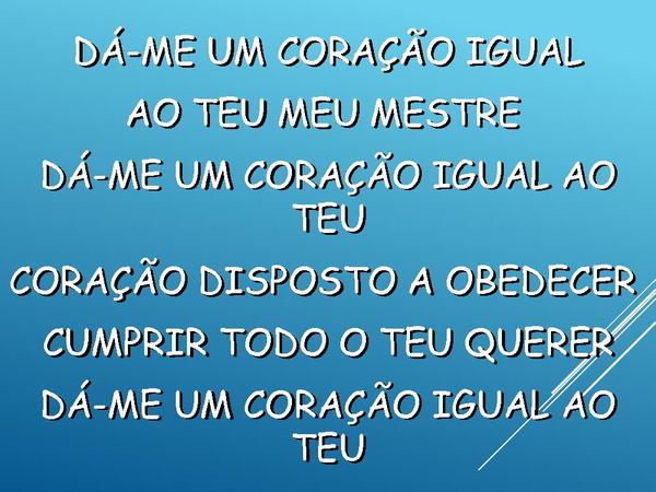 - DÁ-ME UM CORAÇÃO IGUALAO TEU MEU MESTRE DÁ-ME UM CORAÇÃO IGUAL AO TEUCORAÇÃO DISPOSTO A OBEDECER CUMPRIR TODO O TEU QUERERDÁ-ME UM CORAÇÃO IGUAL AO TEU