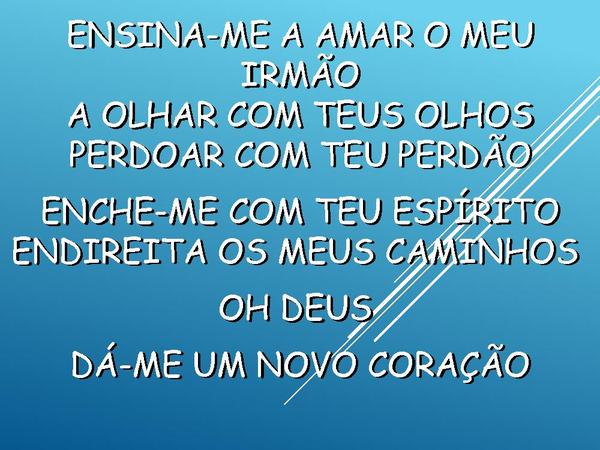 - ENSINA-ME A AMAR O MEU IRMÃOA OLHAR COM TEUS OLHOSPERDOAR COM TEU PERDÃOENCHE-ME COM TEU ESPÍRITOENDIREITA OS MEUS CAMINHOS OH DEUS DÁ-ME UM NOVO CORAÇÃO