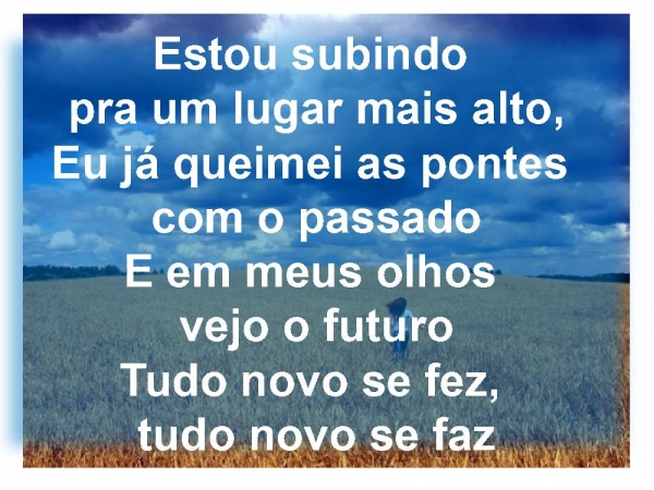 - Estou subindo pra um lugar mais alto, Eu já queimei as pontes com o passado E em meus olhos vejo o futuro Tudo novo se fez, tudo novo se faz