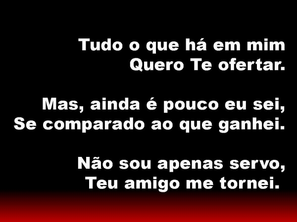 - Tudo o que há em mimQuero Te ofertar.Mas, ainda é pouco eu sei,Se comparado ao que ganhei.Não sou apenas servo,Teu amigo me tornei.