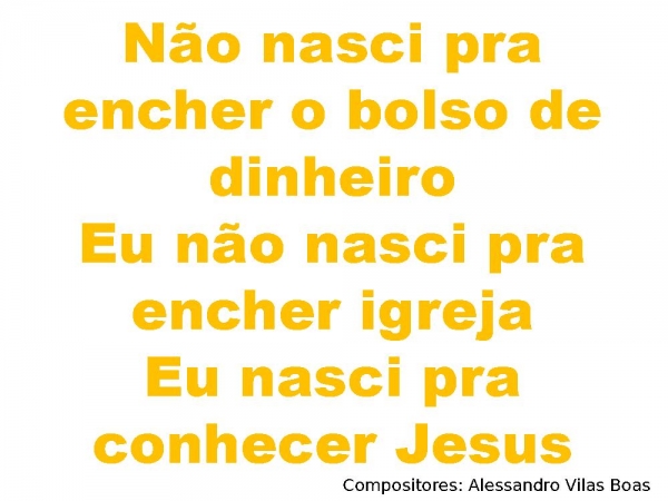 - Não nasci pra encher o bolso de dinheiroEu não nasci pra encher igrejaEu nasci pra conhecer JesusCompositores: Alessandro Vilas Boas