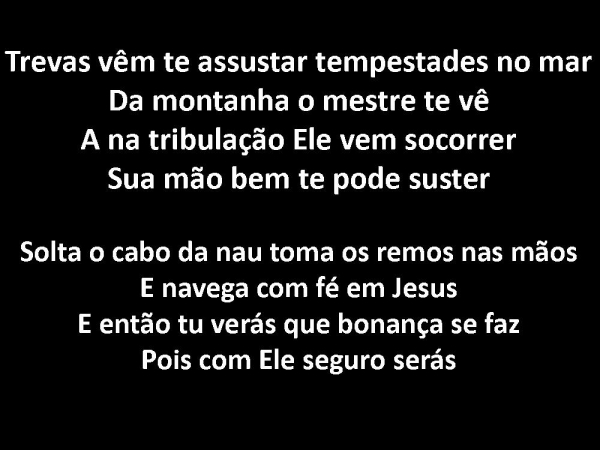 - Trevas vêm te assustar tempestades no marDa montanha o mestre te vêA na tribulação Ele vem socorrerSua mão bem te pode susterSolta o cabo da nau toma os remos nas mãosE navega com fé em JesusE então tu verás que bonança se fazPois com Ele seguro serás