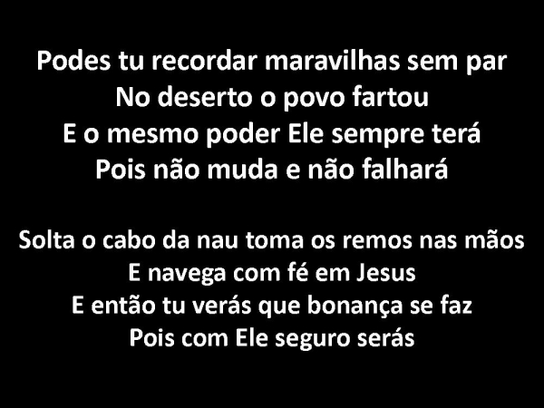 - Podes tu recordar maravilhas sem parNo deserto o povo fartouE o mesmo poder Ele sempre teráPois não muda e não falharáSolta o cabo da nau toma os remos nas mãosE navega com fé em JesusE então tu verás que bonança se fazPois com Ele seguro serás