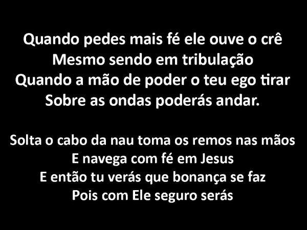 - Quando pedes mais fé ele ouve o crêMesmo sendo em tribulaçãoQuando a mão de poder o teu ego tirarSobre as ondas poderás andar.Solta o cabo da nau toma os remos nas mãosE navega com fé em JesusE então tu verás que bonança se fazPois com Ele seguro serás