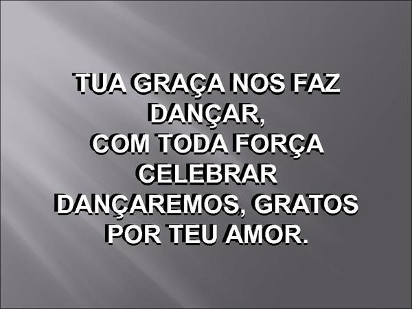 - TUA GRAÇA NOS FAZ DANÇAR,COM TODA FORÇA CELEBRARDANÇAREMOS, GRATOS POR TEU AMOR.TUA GRAÇA NOS FAZ DANÇAR,COM TODA FORÇA CELEBRARDANÇAREMOS, GRATOS POR TEU AMOR.