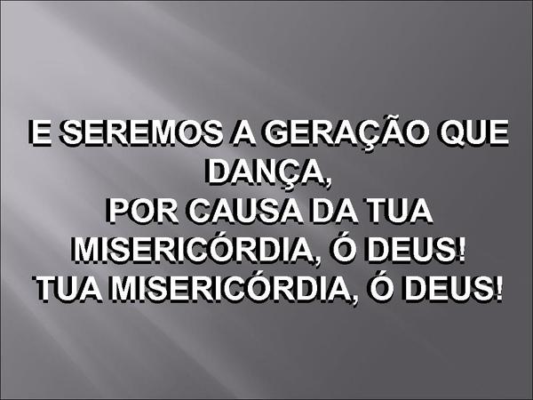 - E SEREMOS A GERAÇÃO QUE DANÇA,POR CAUSA DA TUA MISERICÓRDIA, Ó DEUS!TUA MISERICÓRDIA, Ó DEUS!E SEREMOS A GERAÇÃO QUE DANÇA,POR CAUSA DA TUA MISERICÓRDIA, Ó DEUS!TUA MISERICÓRDIA, Ó DEUS!