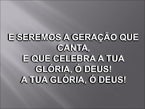 - E SEREMOS A GERAÇÃO QUE CANTA,E QUE CELEBRA A TUA GLÓRIA, Ó DEUS!A TUA GLÓRIA, Ó DEUS!E SEREMOS A GERAÇÃO QUE CANTA,E QUE CELEBRA A TUA GLÓRIA, Ó DEUS!A TUA GLÓRIA, Ó DEUS!