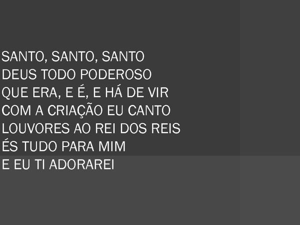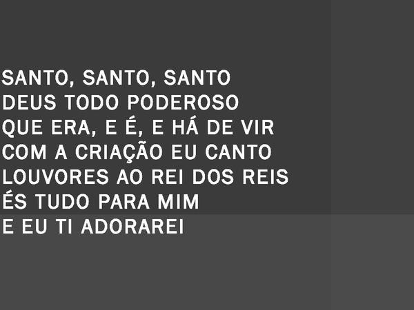 - SANTO, SANTO, SANTO DEUS TODO PODEROSO QUE ERA, E É, E HÁ DE VIR COM A CRIAÇÃO EU CANTO LOUVORES AO REI DOS REIS ÉS TUDO PARA MIM E EU TI ADORAREI