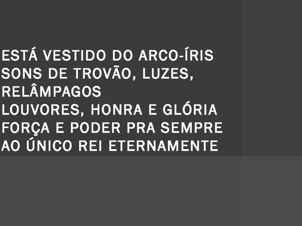 - ESTÁ VESTIDO DO ARCO-ÍRIS SONS DE TROVÃO, LUZES, RELÂMPAGOS LOUVORES, HONRA E GLÓRIA FORÇA E PODER PRA SEMPRE AO ÚNICO REI ETERNAMENTE