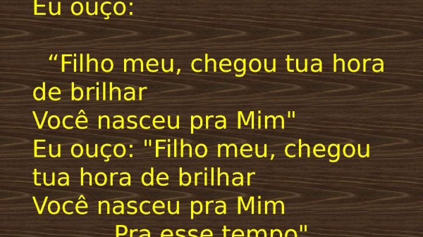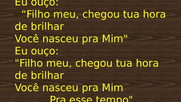 - Eu ouço: “Filho meu, chegou tua hora de brilhar Você nasceu pra Mim" Eu ouço: "Filho meu, chegou tua hora de brilhar Você nasceu pra Mim Pra esse tempo"