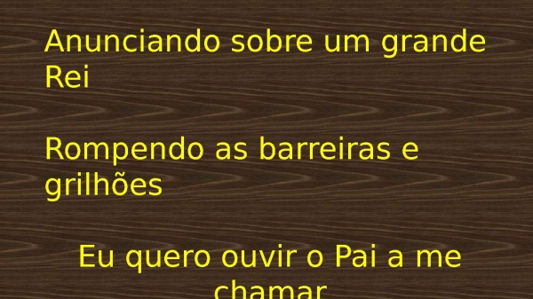 - Posso ouvir o santo som aqui Anunciando sobre um grande Rei Rompendo as barreiras e grilhões Eu quero ouvir o Pai a me chamar