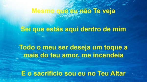 - Mesmo que eu não Te vejaSei que estás aqui dentro de mimTodo o meu ser deseja um toque a mais do teu amor, me incendeiaE o sacrifício sou eu no Teu Altar