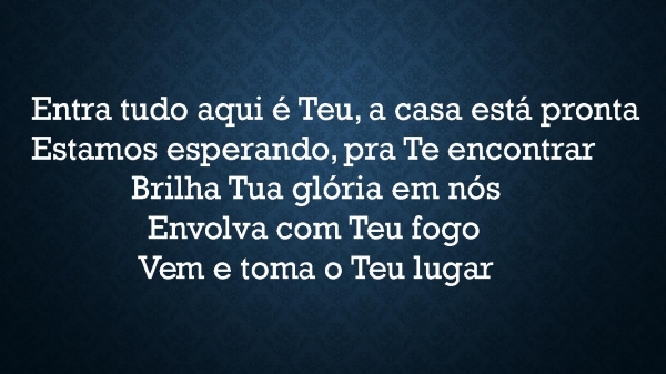 - Entra tudo aqui é Teu, a casa está prontaEstamos esperando, pra Te encontrar Brilha Tua glória em nós Envolva com Teu fogo Vem e toma o Teu lugar