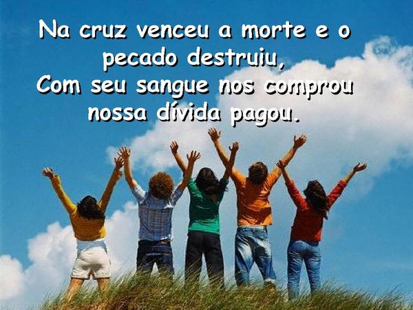 - Na cruz venceu a morte e o pecado destruiu,Com seu sangue nos comprou nossa dívida pagou.