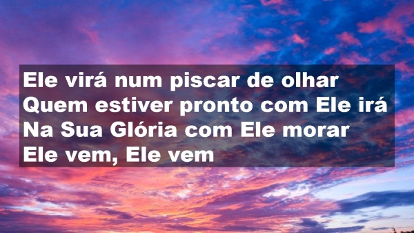 - Ele virá num piscar de olharQuem estiver pronto com Ele iráNa Sua Glória com Ele morarEle vem, Ele vem