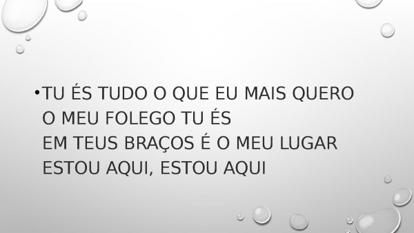 - Tu És tudo o que eu mais queroO meu folego tu ÉsEm Teus braços é o meu lugarEstou aqui, estou aqui