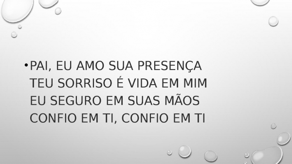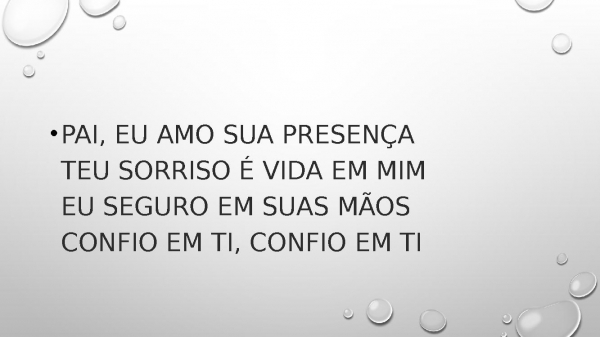 - Pai, eu amo sua presençaTeu sorriso é vida em mimEu seguro em suas mãosConfio em Ti, confio em Ti