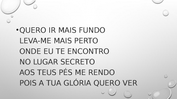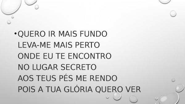 - Quero ir mais fundoLeva-me mais pertoOnde eu Te encontrono Lugar SecretoAos Teus pés me rendoPois a Tua Glória quero ver