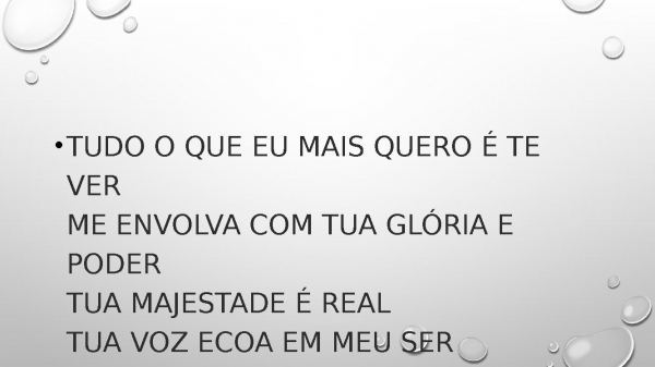 - Tudo o que eu mais quero é Te verMe envolva com Tua Glória e PoderTua Majestade é realTua voz ecoa em meu ser