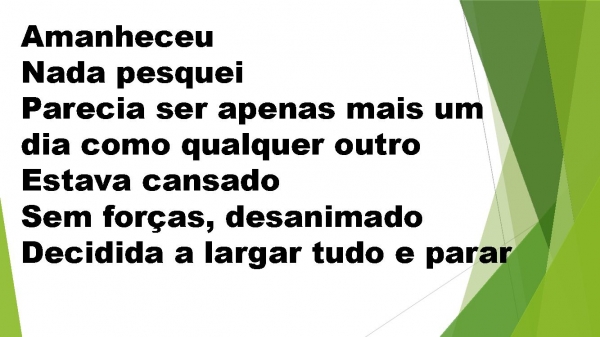- AmanheceuNada pesqueiParecia ser apenas mais um dia como qualquer outroEstava cansadoSem forças, desanimadoDecidida a largar tudo e parar
