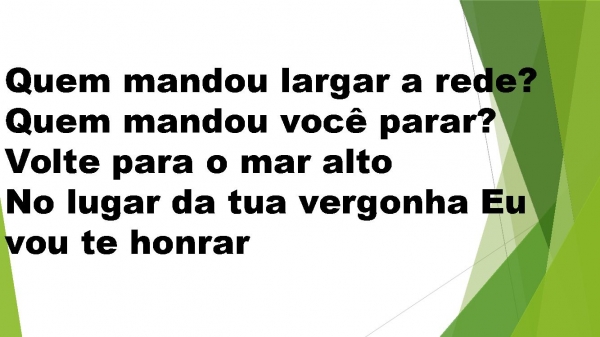 - Quem mandou largar a rede?Quem mandou você parar?Volte para o mar altoNo lugar da tua vergonha Eu vou te honrar