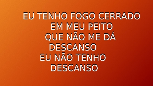 - EU TENHO FOGO CERRADOEM MEU PEITOQUE NÃO ME DÁ DESCANSO EU NÃO TENHO DESCANSOEU TENHO FOGO CERRADOEM MEU PEITOQUE NÃO ME DÁ DESCANSO EU NÃO TENHO DESCANSO