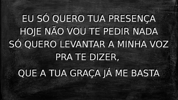 - EU SÓ QUERO TUA PRESENÇAHOJE NÃO VOU TE PEDIR NADASÓ QUERO LEVANTAR A MINHA VOZPRA TE DIZER, QUE A TUA GRAÇA JÁ ME BASTAEU SÓ QUERO TUA PRESENÇAHOJE NÃO VOU TE PEDIR NADASÓ QUERO LEVANTAR A MINHA VOZPRA TE DIZER, QUE A TUA GRAÇA JÁ ME BASTA