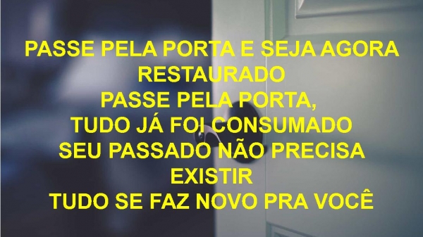 - PASSE PELA PORTA E SEJA AGORA RESTAURADOPASSE PELA PORTA, TUDO JÁ FOI CONSUMADOSEU PASSADO NÃO PRECISA EXISTIRTUDO SE FAZ NOVO PRA VOCÊ