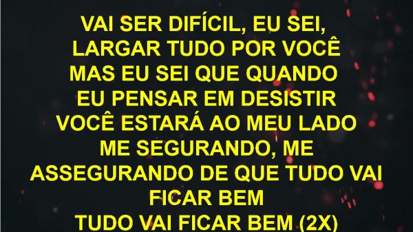 - VAI SER DIFÍCIL, EU SEI, LARGAR TUDO POR VOCÊMAS EU SEI QUE QUANDO EU PENSAR EM DESISTIRVOCÊ ESTARÁ AO MEU LADOME SEGURANDO, ME ASSEGURANDO DE QUE TUDO VAI FICAR BEMTUDO VAI FICAR BEM (2X)