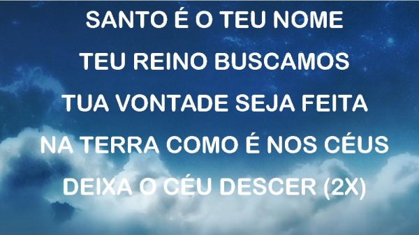 - PAI NOSSO, NOS CÉUSSANTO É O TEU NOMETEU REINO BUSCAMOSTUA VONTADE SEJA FEITANA TERRA COMO É NOS CÉUSDEIXA O CÉU DESCER (2X)