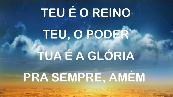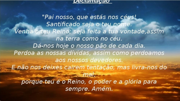 - Declamação "Pai nosso, que estás nos céus!Santificado seja o teu nome.Venha o teu Reino; seja feita a tua vontade,assim na terra como no céu.Dá-nos hoje o nosso pão de cada dia.Perdoa as nossas dívidas, assim como perdoamos aos nossos devedores.E não nos deixes cairem tentação, mas livra-nos do mal,porque teu é o Reino, o poder e a glória para sempre. Amém.