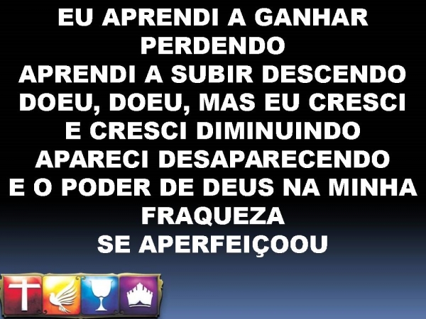 - EU APRENDI A GANHAR PERDENDOAPRENDI A SUBIR DESCENDODOEU, DOEU, MAS EU CRESCIE CRESCI DIMINUINDOAPARECI DESAPARECENDOE O PODER DE DEUS NA MINHA FRAQUEZASE APERFEIÇOOU