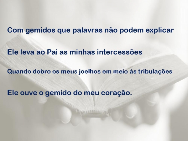 - Com gemidos que palavras não podem explicarEle leva ao Pai as minhas intercessõesQuando dobro os meus joelhos em meio às tribulaçõesEle ouve o gemido do meu coração.