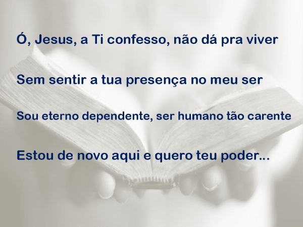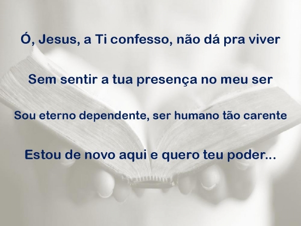 - Ó, Jesus, a Ti confesso, não dá pra viverSem sentir a tua presença no meu serSou eterno dependente, ser humano tão carenteEstou de novo aqui e quero teu poder...