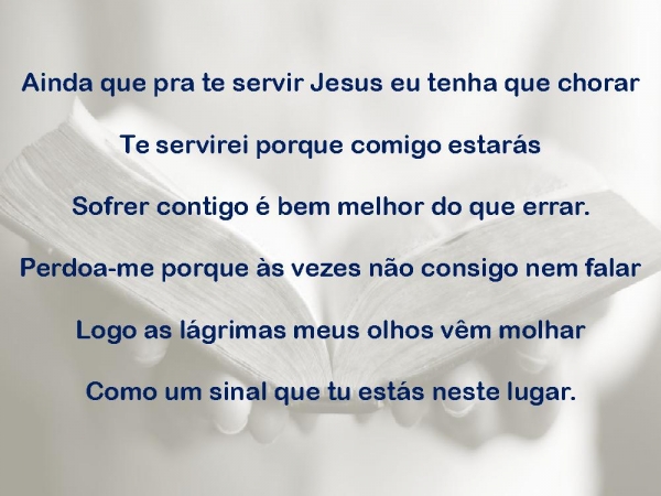- Ainda que pra te servir Jesus eu tenha que chorarTe servirei porque comigo estarásSofrer contigo é bem melhor do que errar.Perdoa-me porque às vezes não consigo nem falarLogo as lágrimas meus olhos vêm molharComo um sinal que tu estás neste lugar.