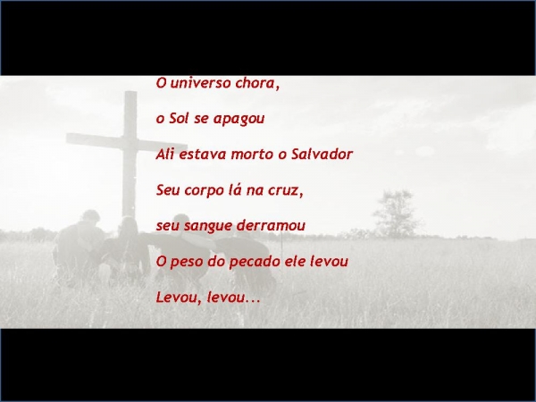 - O universo chora, o Sol se apagouAli estava morto o SalvadorSeu corpo lá na cruz, seu sangue derramouO peso do pecado ele levouLevou, levou...