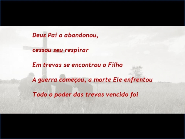 - Deus Pai o abandonou, cessou seu respirarEm trevas se encontrou o FilhoA guerra começou, a morte Ele enfrentouTodo o poder das trevas vencido foi