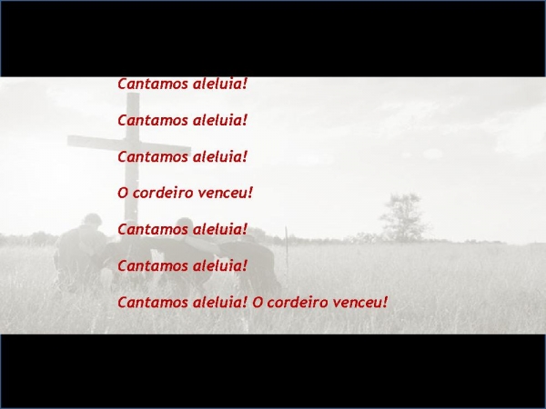- Cantamos aleluia! Cantamos aleluia!Cantamos aleluia! O cordeiro venceu!Cantamos aleluia! Cantamos aleluia!Cantamos aleluia! O cordeiro venceu!