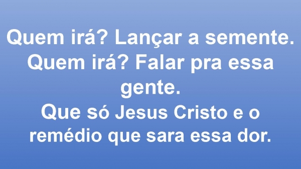 - Quem irá? Lançar a semente.Quem irá? Falar pra essa gente.Que só Jesus Cristo e o remédio que sara essa dor.