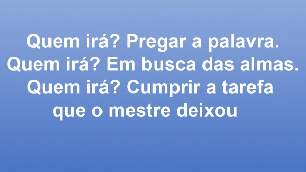 - Quem irá? Pregar a palavra.Quem irá? Em busca das almas.Quem irá? Cumprir a tarefa que o mestre deixou