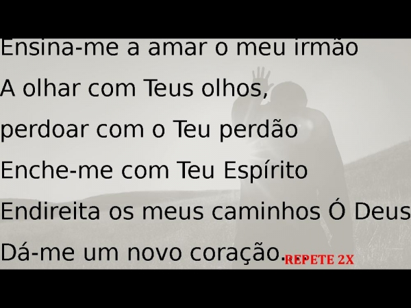 - Ensina-me a amar o meu irmãoA olhar com Teus olhos, perdoar com o Teu perdãoEnche-me com Teu EspíritoEndireita os meus caminhos Ó DeusDá-me um novo coração....REPETE 2X