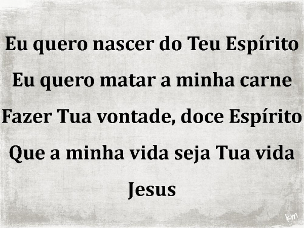- Eu quero nascer do Teu EspíritoEu quero matar a minha carneFazer Tua vontade, doce EspíritoQue a minha vida seja Tua vidaJesus