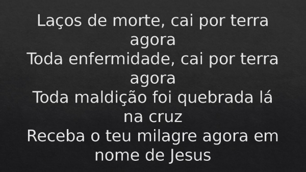 - Laços de morte, cai por terra agoraToda enfermidade, cai por terra agoraToda maldição foi quebrada lá na cruzReceba o teu milagre agora em nome de Jesus