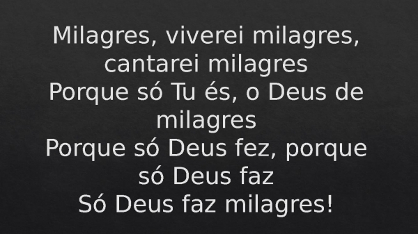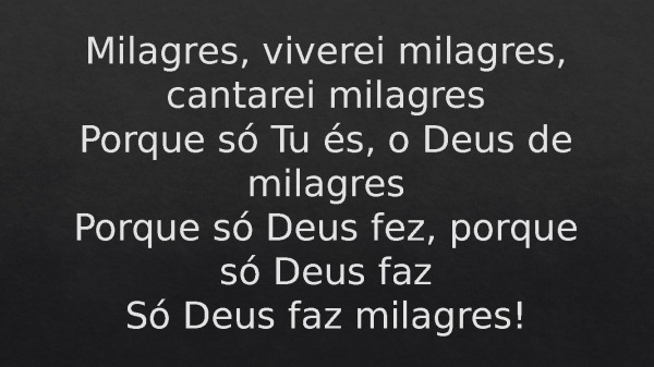 - Milagres, viverei milagres, cantarei milagresPorque só Tu és, o Deus de milagresPorque só Deus fez, porque só Deus fazSó Deus faz milagres!