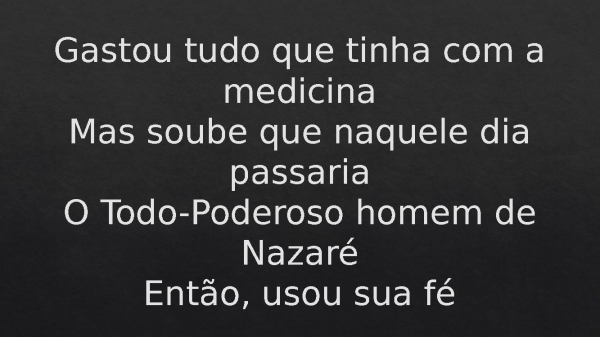 - Gastou tudo que tinha com a medicinaMas soube que naquele dia passariaO Todo-Poderoso homem de NazaréEntão, usou sua fé