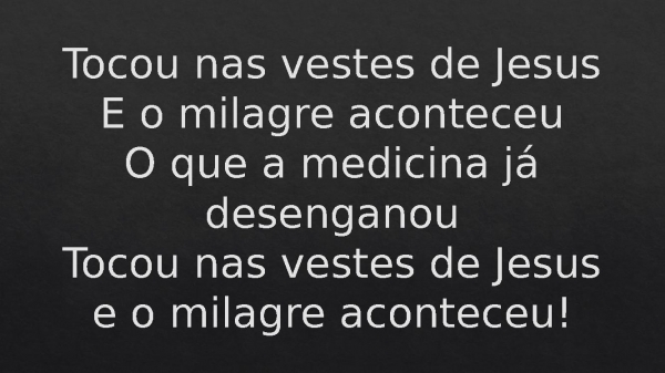 - Tocou nas vestes de JesusE o milagre aconteceuO que a medicina já desenganouTocou nas vestes de Jesus e o milagre aconteceu!