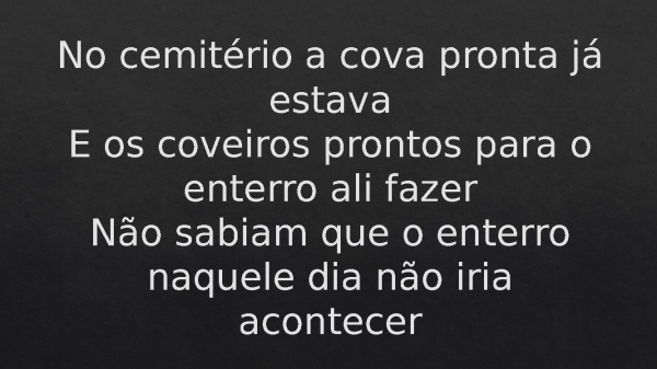 - No cemitério a cova pronta já estavaE os coveiros prontos para o enterro ali fazerNão sabiam que o enterro naquele dia não iria acontecer
