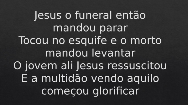 - Jesus o funeral então mandou pararTocou no esquife e o morto mandou levantarO jovem ali Jesus ressuscitouE a multidão vendo aquilo começou glorificar