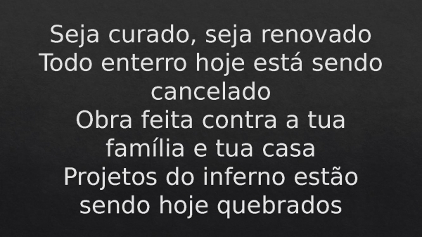 - Seja curado, seja renovadoTodo enterro hoje está sendo canceladoObra feita contra a tua família e tua casaProjetos do inferno estão sendo hoje quebrados