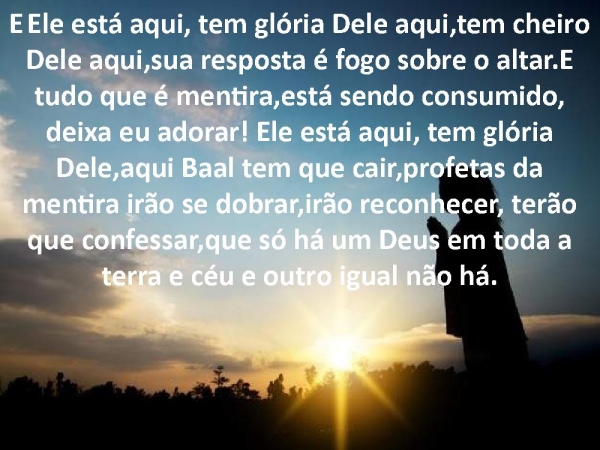 - E Ele está aqui, tem glória Dele aqui,tem cheiro Dele aqui,sua resposta é fogo sobre o altar.E tudo que é mentira,está sendo consumido, deixa eu adorar! Ele está aqui, tem glória Dele,aqui Baal tem que cair,profetas da mentira irão se dobrar,irão reconhecer, terão que confessar,que só há um Deus em toda a terra e céu e outro igual não há.